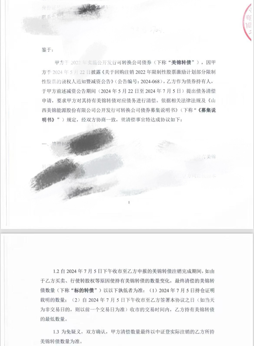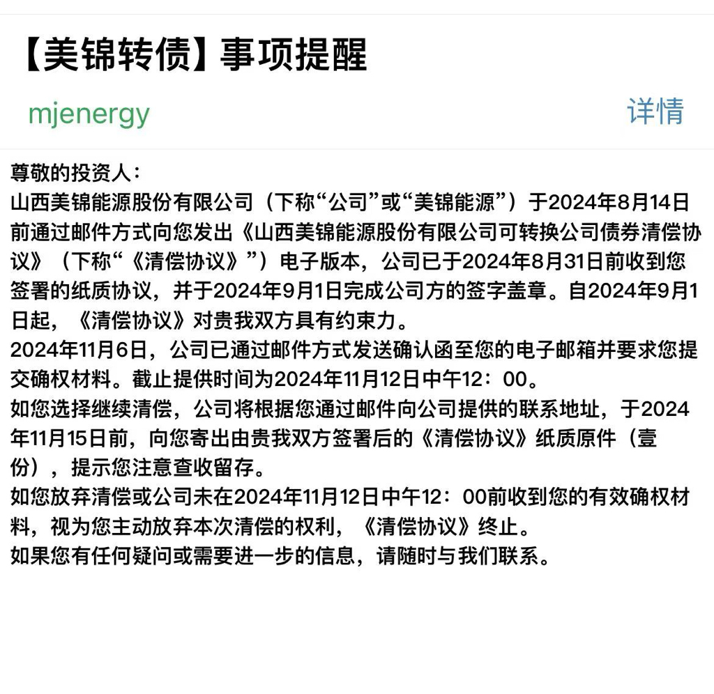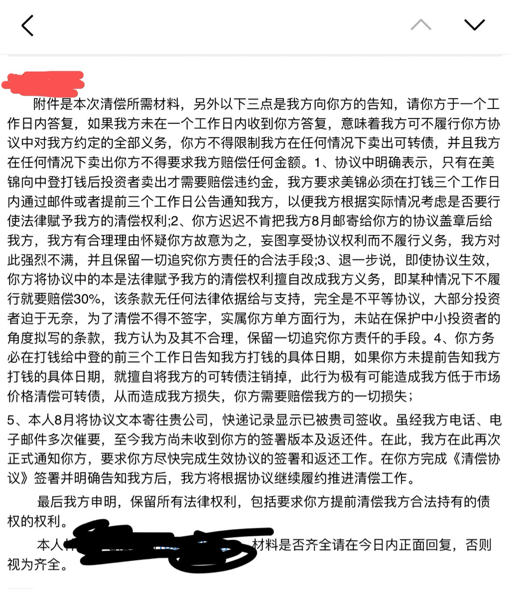 附件是本次清偿所需材料,另外以下三点是我方向你方的告知,请你方于一个工作日内答复,如果我方未在一个工作日内收到你方答复,意味着我方可不履行你方协议中对我方约定的全部义务,你方不得限制我方在任何情况下卖出可转债,并且我方在任何情况下卖出你方不得要求我方赔偿任何金额。1、协议中明确表示,只有在美锦向中登打钱后投资者卖出才需要赔偿违约金,我方要求美锦必须在打钱三个工作日内通过邮件或者提前三个工作日公告通知我方,以便我方根据实际情况考虑是否要行使法律赋予我方的清偿权利;2、你方迟迟不肯把我方8月邮寄给你方的协议盖章后给我方,我方有合理理由怀疑你方故意为之,妄图享受协议权利而不履行义务,我方对此强烈不满,并且保留一切追究你方责任的合法手段;3、退一步说,即使协议生效,你方将协议中的本是法律赋予我方的清偿权利擅自改成我方义务,即某种情况下不履行就要赔偿30%,该条款无任何法律依据给与支持,完全是不平等协议,大部分投资者迫于无奈,为了清偿不得不签字,实属你方单方面行为,未站在保护中小投资者的角度拟写的条款,我方认为及其不合理,保留一切追究你方责仟的手段。4、你方务必在打钱给中登的前三个工作日告知我方打钱的具体日期,如果你方未提前告知我方打钱的具体日期,就擅自将我方的可转债注销掉,此行为极有可能造成我方低于市场价格清偿可转债,从而造成我方损失,你方需要赔偿我方的一切损失;