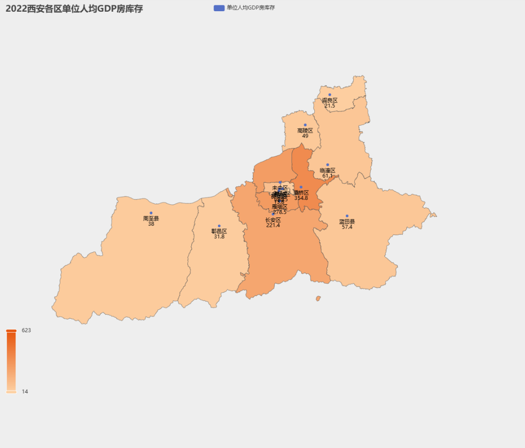 西安单位人均GDP商品房库存:灞桥区最高354.8平米,碑林区最低13.8平米。