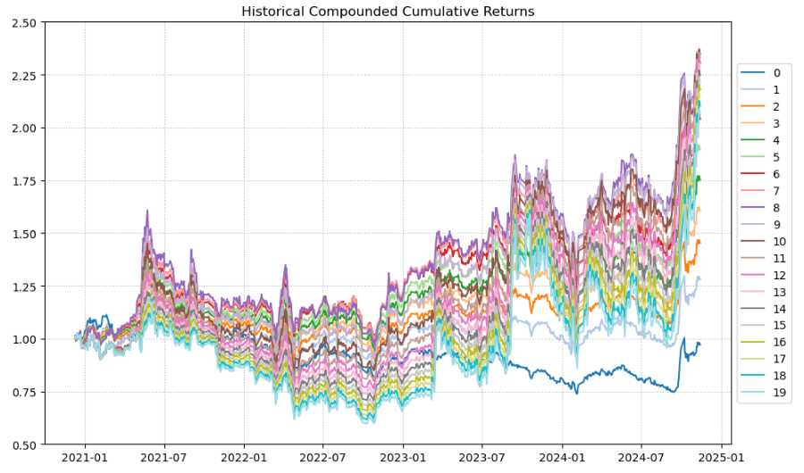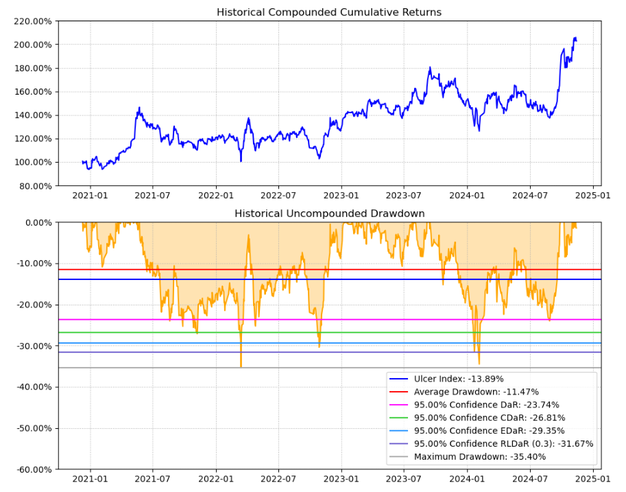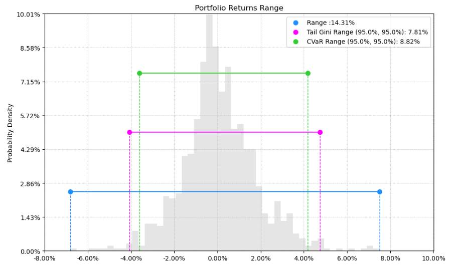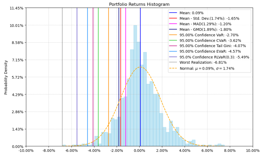 最后看下整个投资组合的情况,日度均值回报在0.09%,跟昨天测的通信设备行业差不多,而且8.82%的CVaR也更低更稳健。