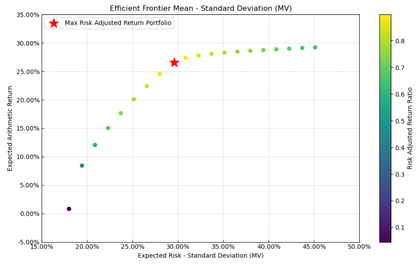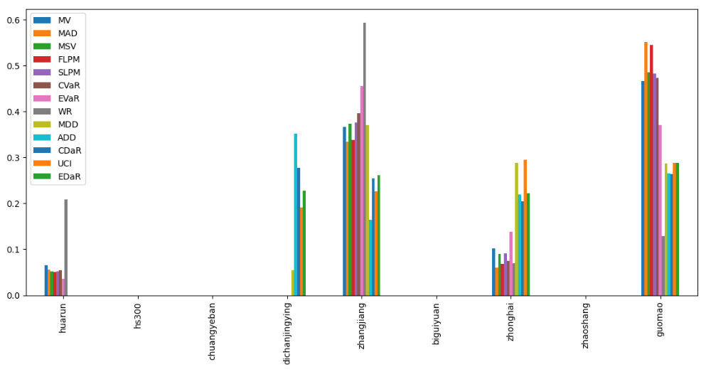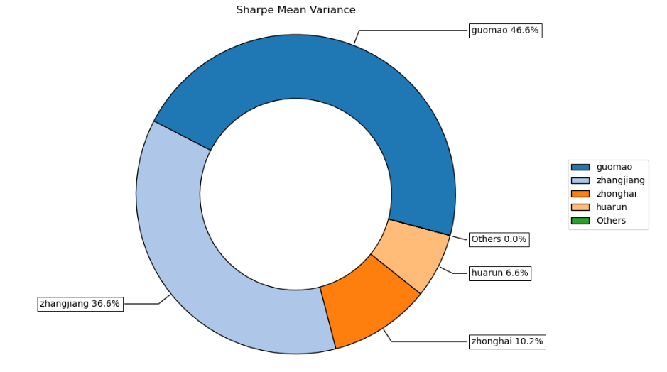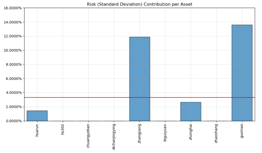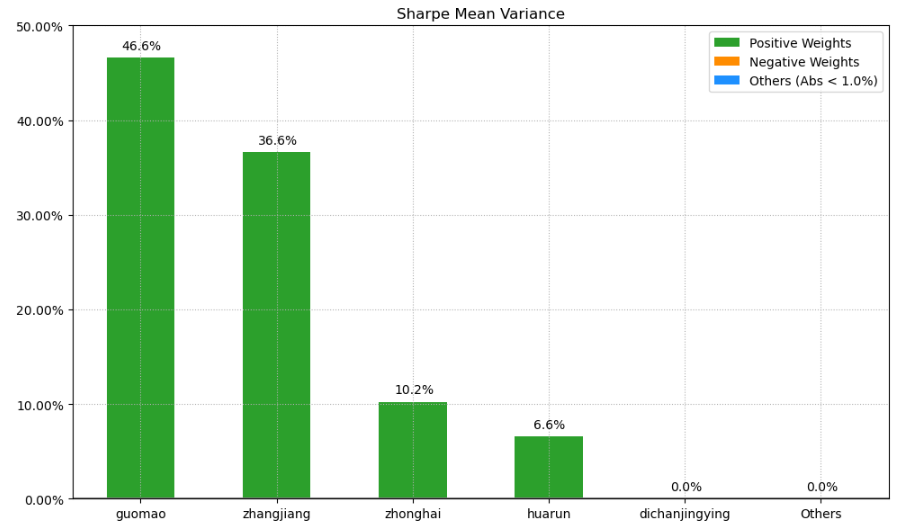 按最高夏普比率配置的话,系统给的权重仅6.6%,最大权重的中国国贸占比近47%。