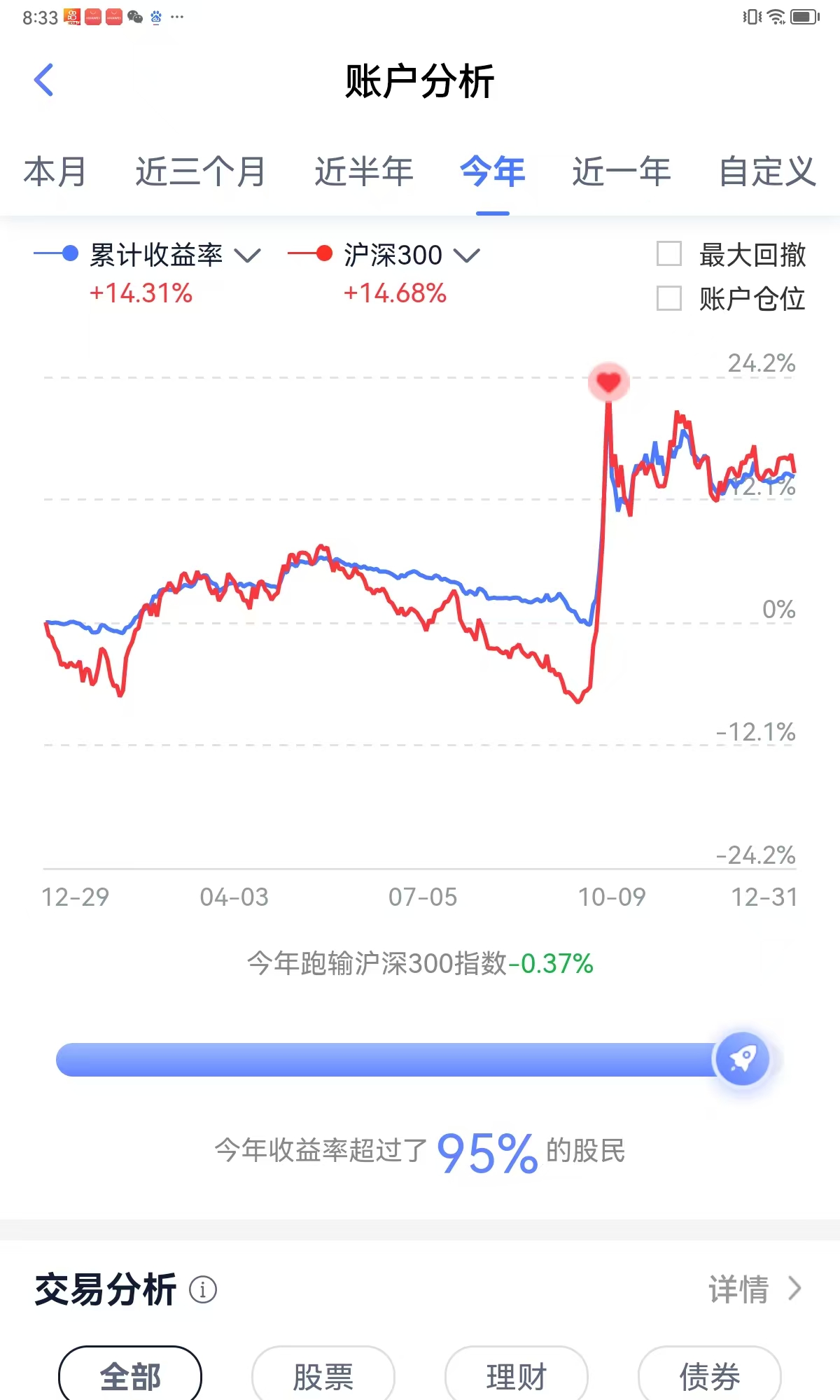 在试错中成长——2024年度小结 投资不仅仅是为了赚钱,它是人生不可或缺的一部分,不管你是喜欢还是不喜欢,主动或被动投资一定伴随你的一生。刚刚过去的一年获得14.31%年收益,虽然成绩并不亮眼,但对于一名追求绝对回报的低风险投资者来说已经知足了。在波动剧烈的投资市场,能把回撤控制好是我的追求和坚持,不管市场有多极端,不亏或把亏损控制在百分之五以内是全年投资最大亮点。回顾过去的一年,投...预祝2025长红
