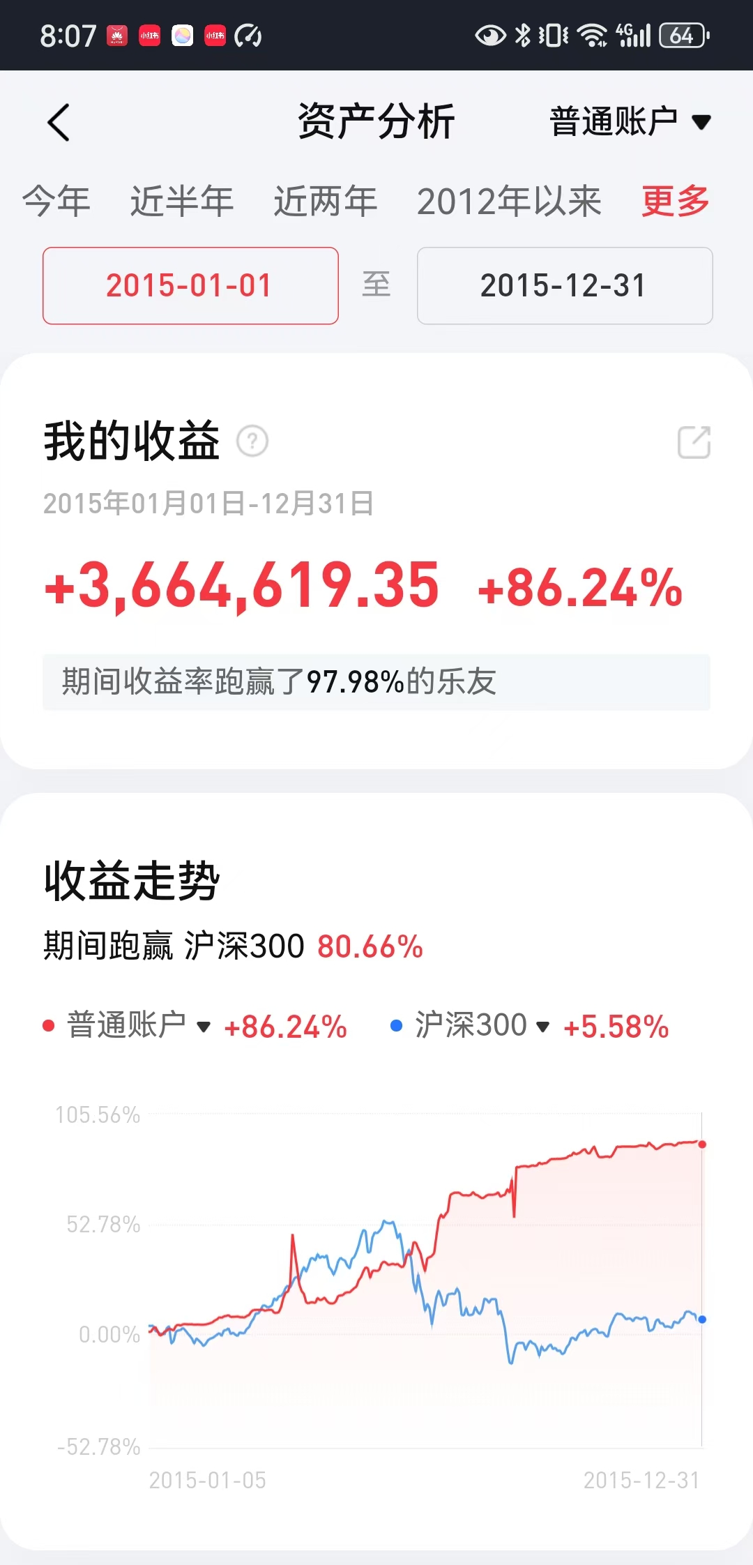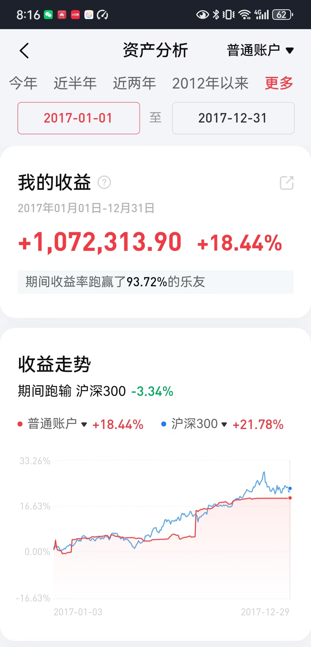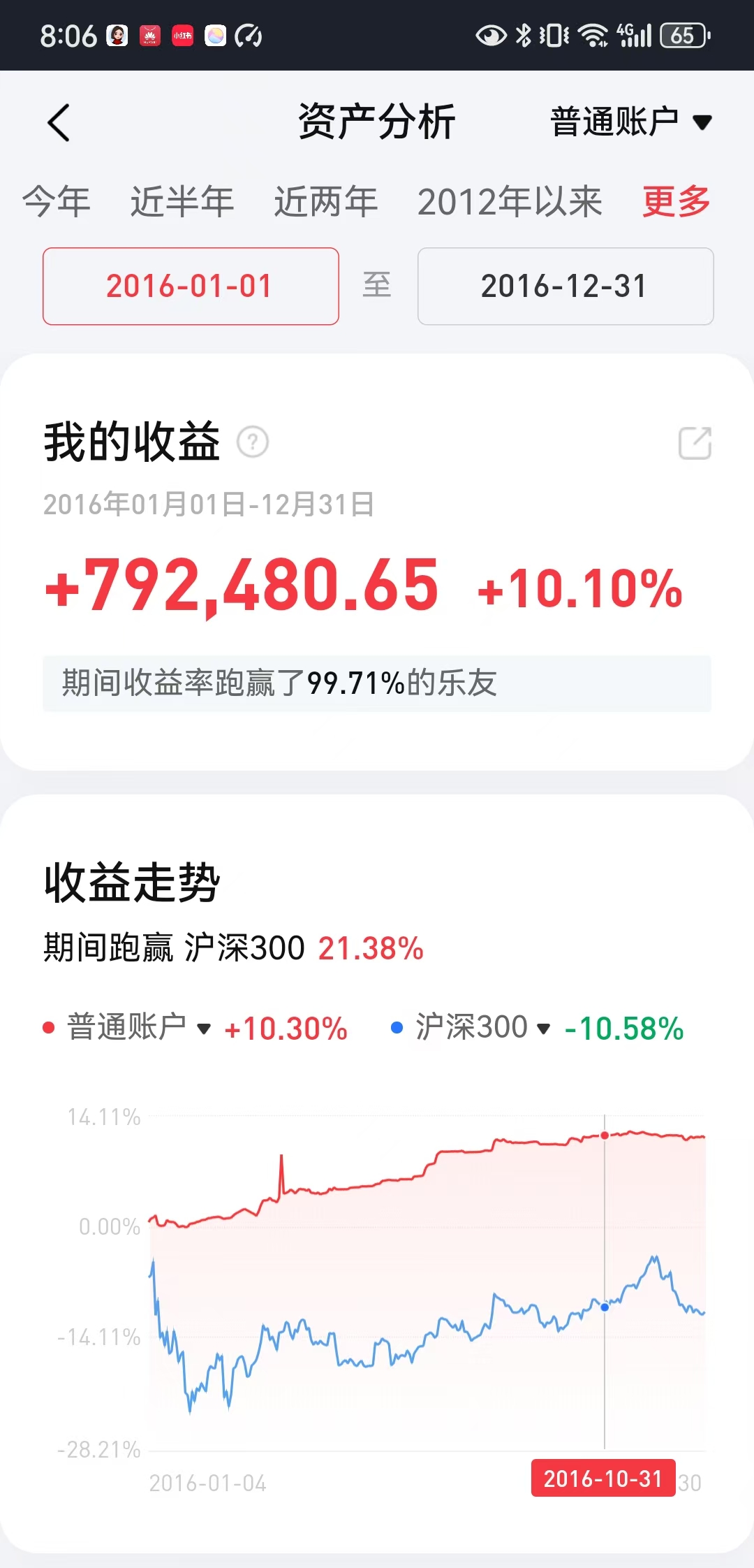 一年辛辛苦苦高频操作结果是为券商打工,令我意外的是平时不管一年操作次数在个位数的另外两个帐户分别获得百分之十一和百分之十二以上的年度收益,因此投资收益与努力程度并不成正比,方向错了越努力越亏损,认知正确操作次数少一样有好收成。