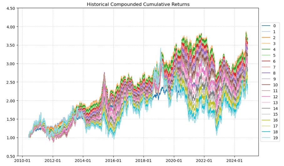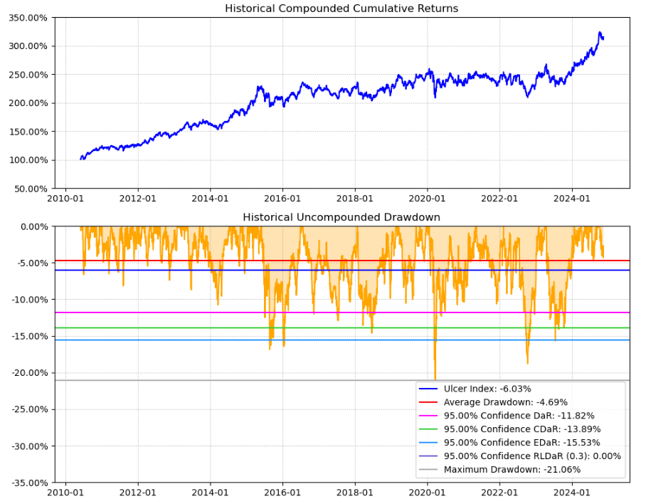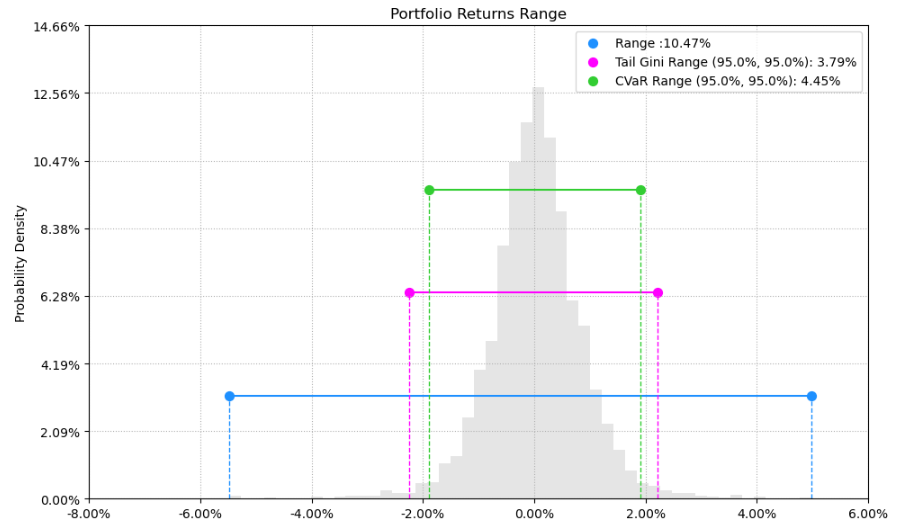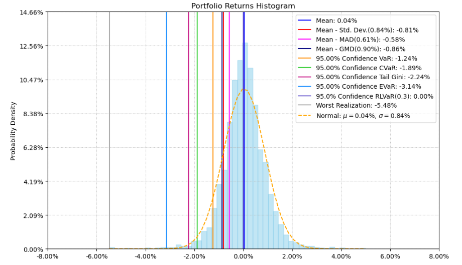 最后看下整个投资组合的情况,日度均值回报在0.04%,比昨天测的地产经营行业差了一半多,不过4.45%的CVaR波动也是罕见地低。