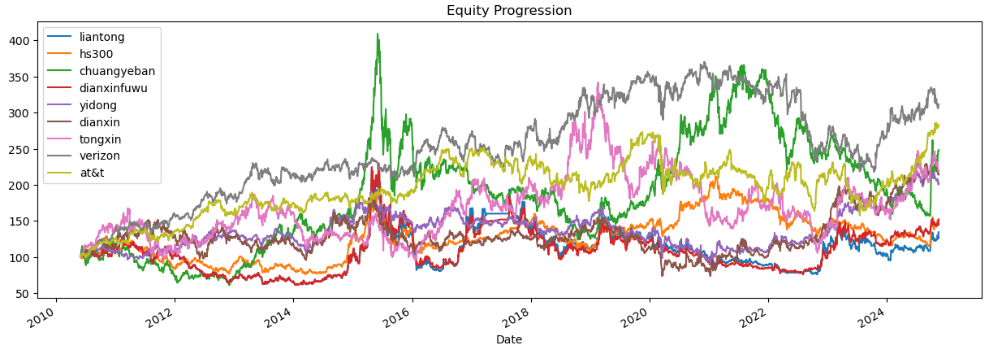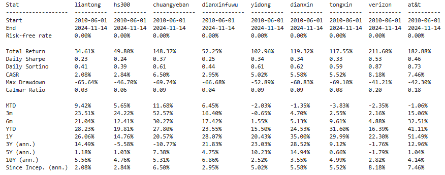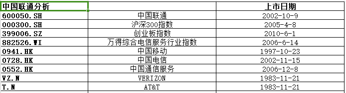 中国联通,基本面有点差,历史表现也很拉胯,不建议配置。整个电信服务行业历史表现很稳健,适合寻求低波动的投资者,长期来看夏普比率是划算的,如果要找个股的话,美股就看Verizon,大中华市场就看中国移动。