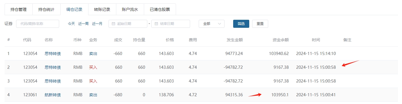 如图,调仓同时买入了两笔,但是资金余额是不足够买入两笔的