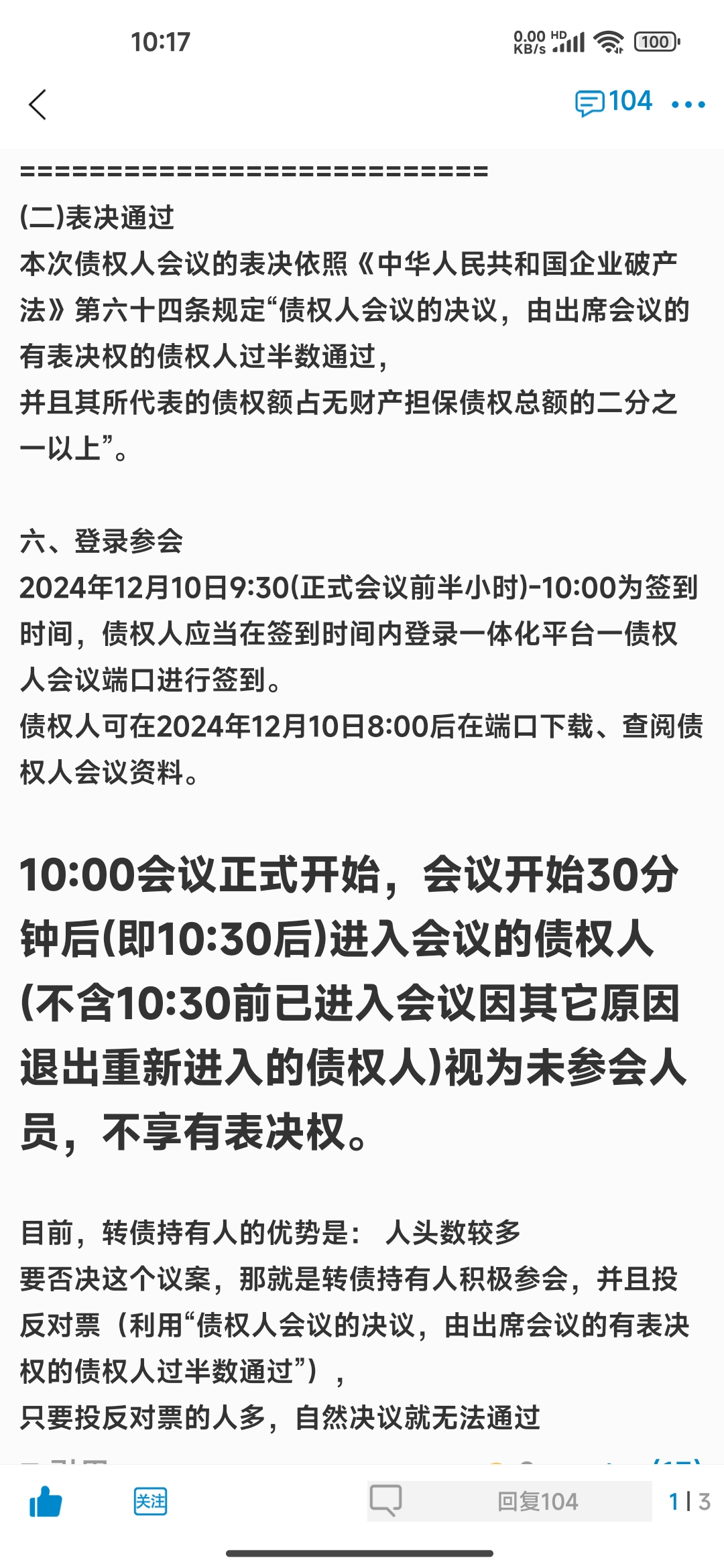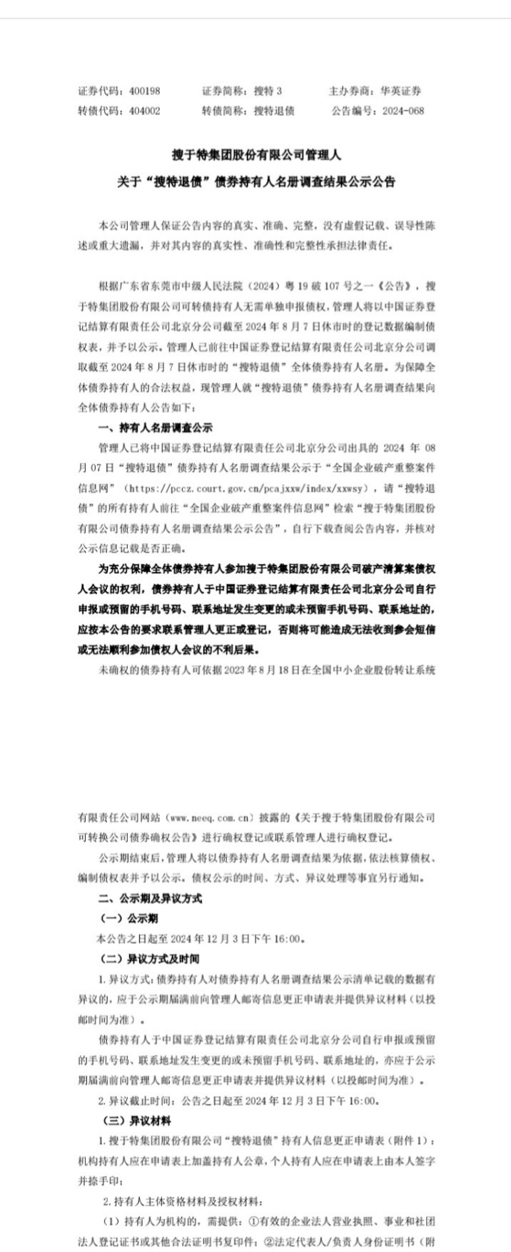 从上面的几点设置可以看出,管理人就是希望我们转债的持有人不参加、不投票、不投反对票,这样达成他们自己的目标:搜特的残值由他们处置,转债的持有人等同于普通的债权,而且是别的债权人分完了之后剩余的。其他债权人分完之后还能有吗?肯定没有了。别想着小额了,别想着还能有10块20块了,如果不积极争取,几毛钱都没有。