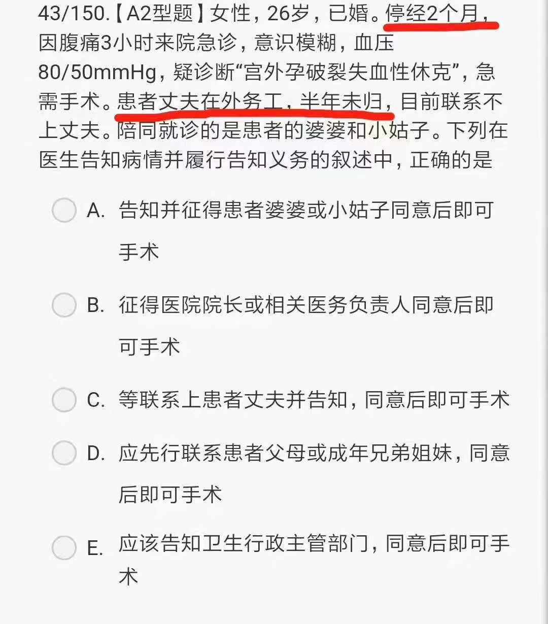 选D,丈夫联系不上应首先联系患者直系亲属,取得同意后开始手术,由患者直系亲属与丈夫和婆婆等沟通