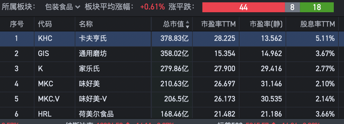 第三个包装食品,市值更高的卡夫,以及市值更低的味好美,都是20+PE