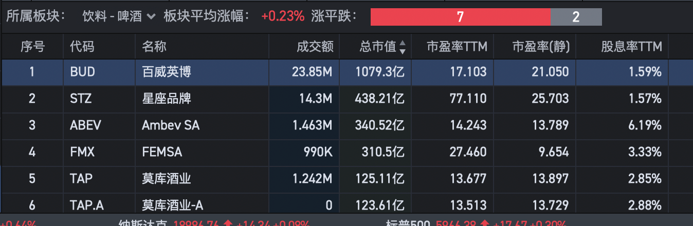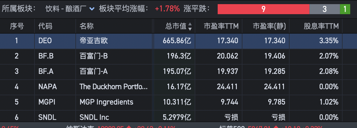 第二个酒类,帝亚吉欧我看到的数据是17倍PE,不知道你的数据源是哪里。另外一个典型的啤酒代表百威英博,21倍PE。