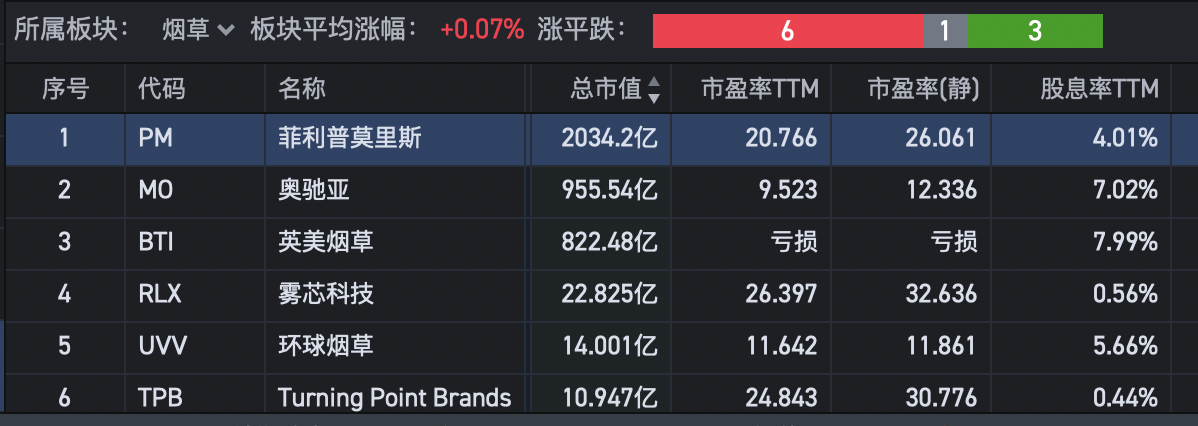 第一个烟草,国内没有上市,不好比较,但是美股烟草市值第一的是菲利普莫里斯,市值是奥驰亚两倍,26倍PE。