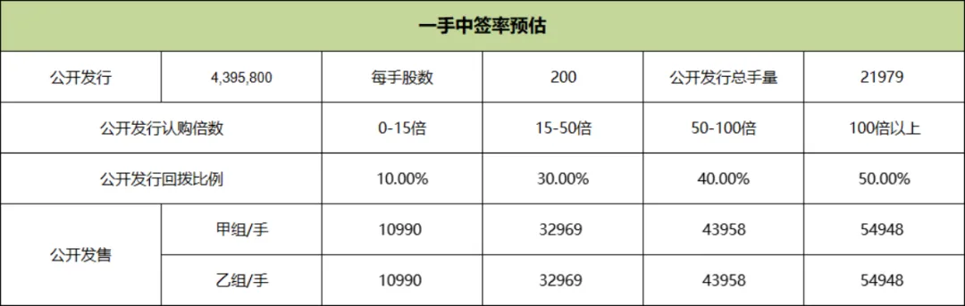 公开发行总计439.58万股,每手200股,公开发行总计21979手,当前超购12倍,假设5000人申购,一手中签率100%。