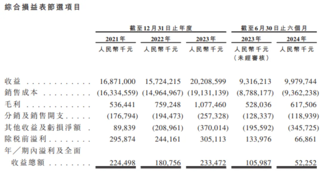 截至2021年、2022年及2023年12月31日止年度及截至2024年6月30日止六个月,公司的收益分别为人民币168.71亿元、157.24亿元、202.09亿元及99.8亿元,毛利率分别为3.2%、4.8%、5.3%及6.2%。