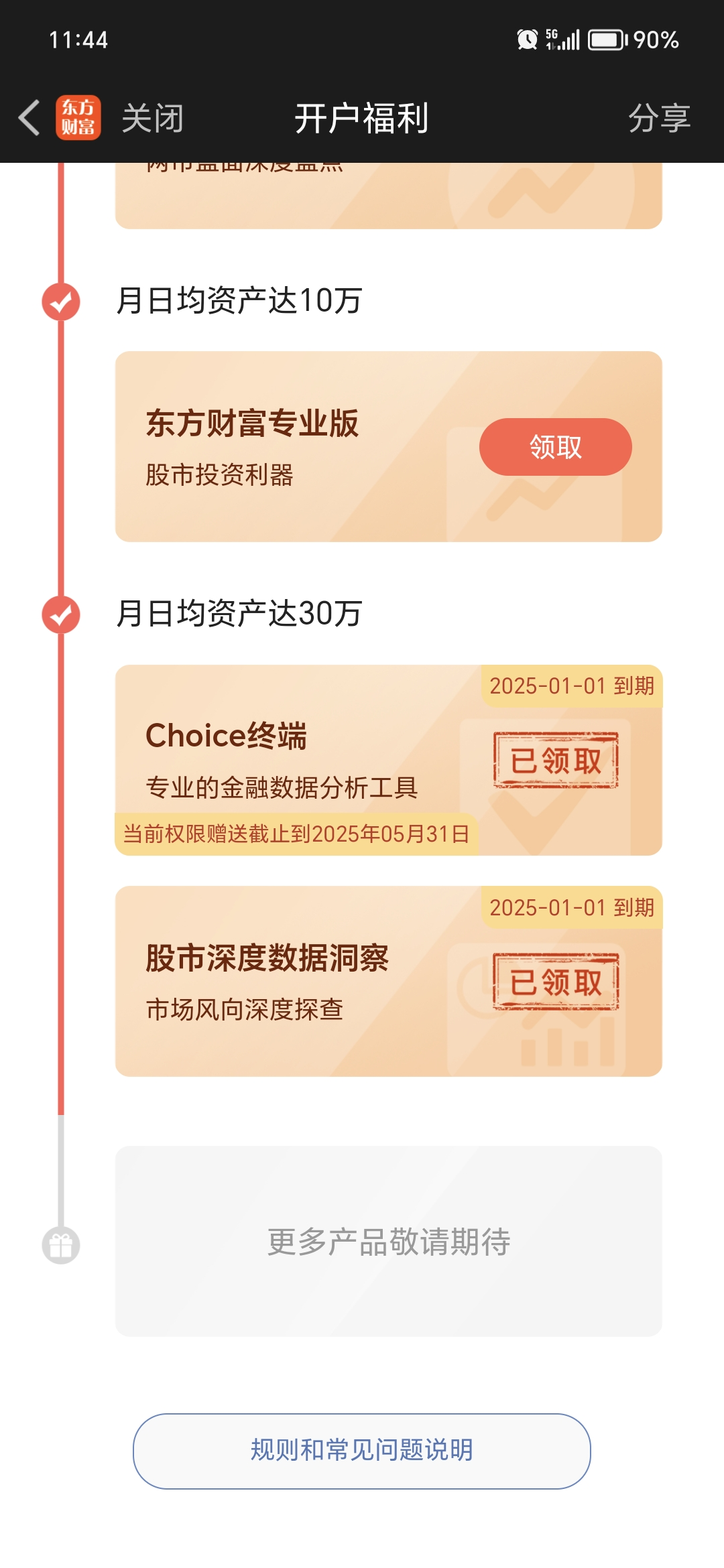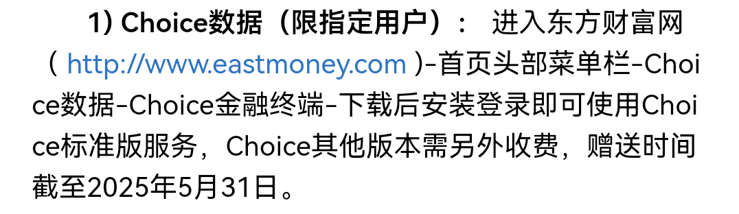 月日均资产30万,每个月可以在开户权益中领取一个月使用权,目前确实显示赠送截止到2025年5月31日,为了这个开户已经没什么必要了,不知道东财为啥要这样,看来要找找其他替代品了,各位集友有没有推荐的领取choice的界面能截个图看看吗? 我看看要不要麻烦试试