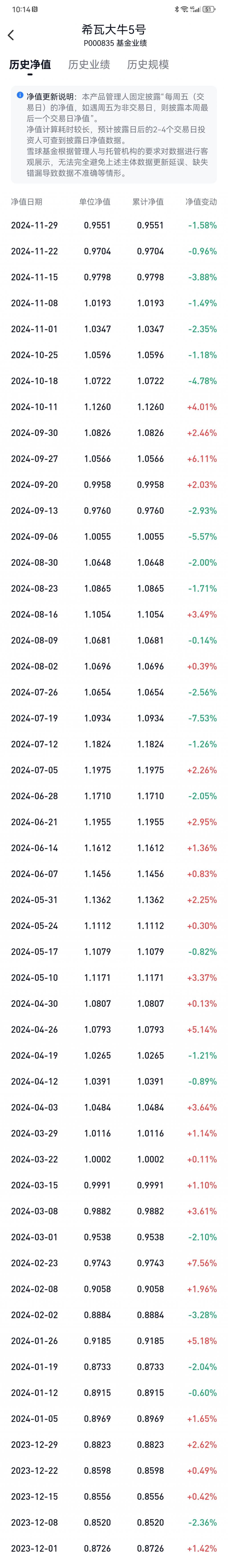 持有希瓦大牛系列,亏损三年多熬到今年,终于在高度重仓中海油和拼多多的上半年,净值浮上水面有了微微的盈利,大金链子马上计提了一次分红。还没开心几天,今年的涨幅便从30%到现在已接近抹去,净值再次回到水下且发生五个点亏损,四年时间的坚守和信任,实在让人一言难尽。