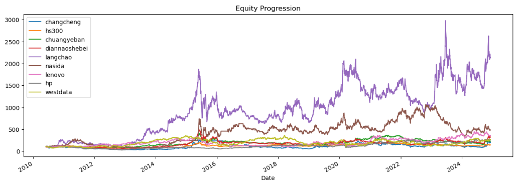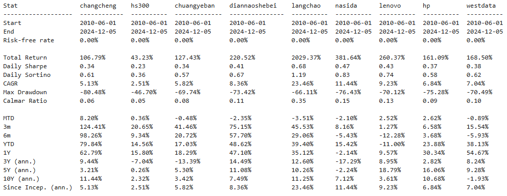 区间累计回报近25倍,最大回撤64.64%,投资组合的表现整体是要好于中国长城个股的。整个电脑设备行业盈利能力很好,但波动偏大,夏普比率0.85属于中上水平。