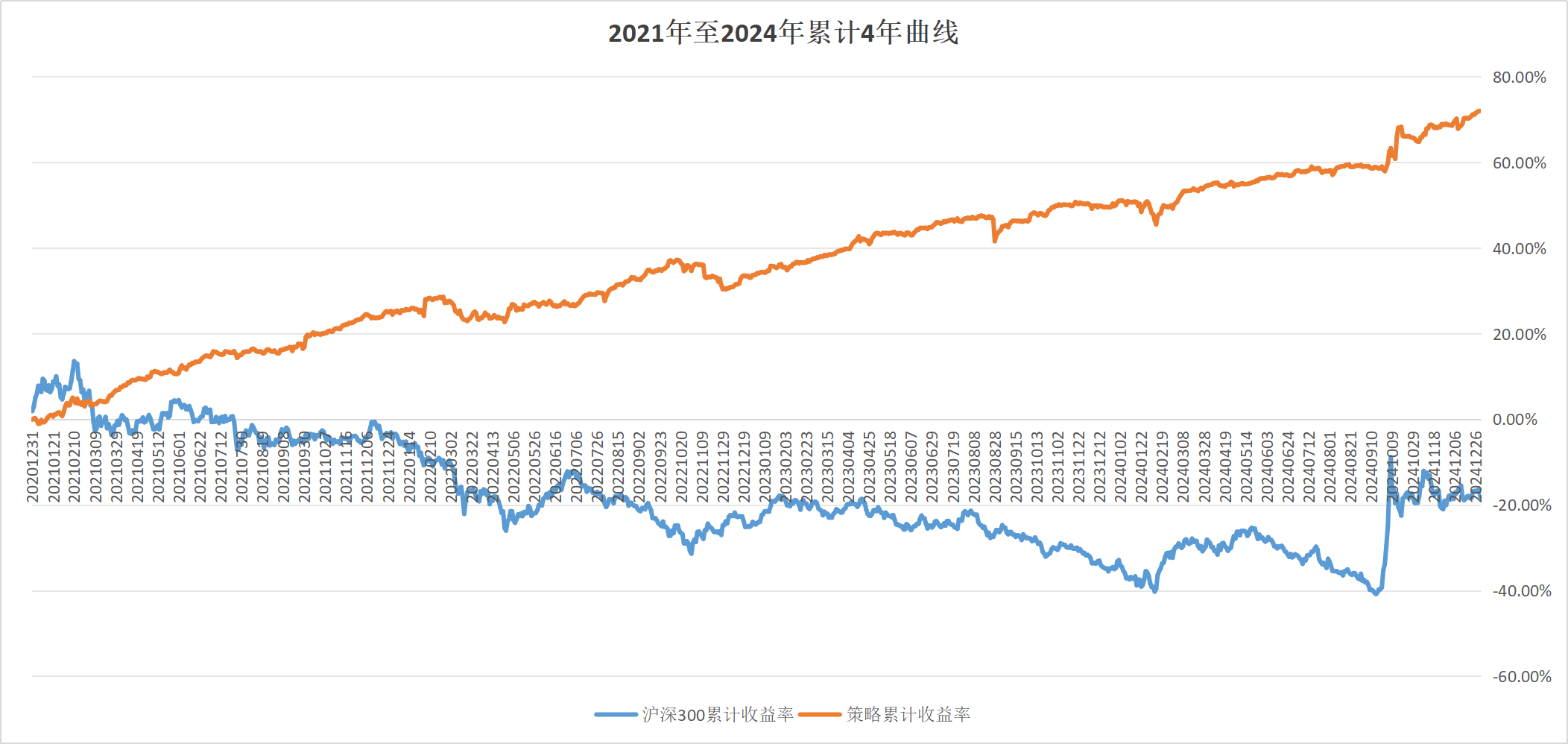 2021-2024累计四年实盘量化曲线,累计收益72.85%,年化收益15.5%,最大回撤5.63%,夏普1.87