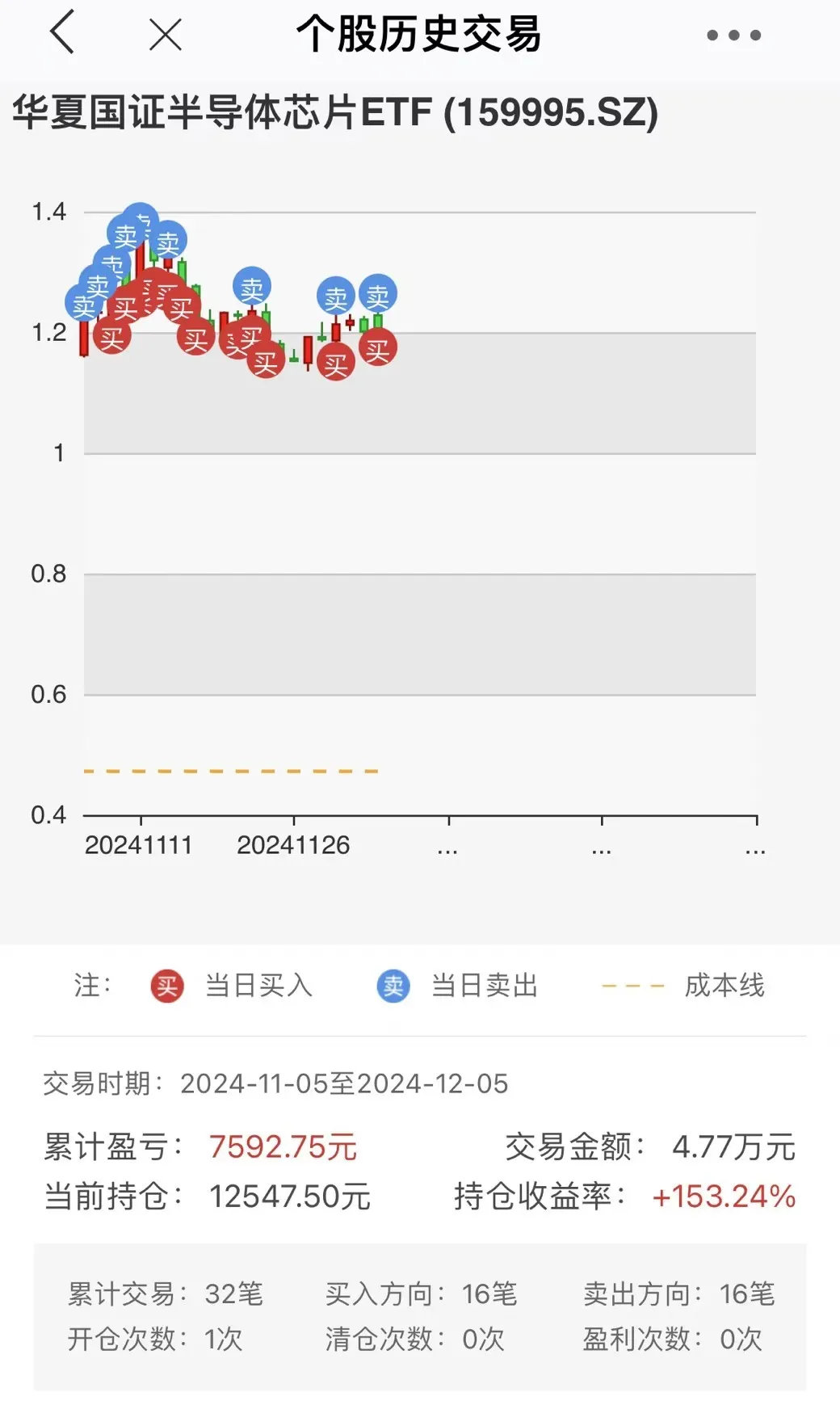 虽然芯片ETF(159995)的当前净值还在1.198,持仓可用10500股,如果单纯按照上涨的收益计算目前也就5到6个点左右收益,但是事实当前的持仓收益超100%,芯片ETF的收益主要来自于网格吃的波动。