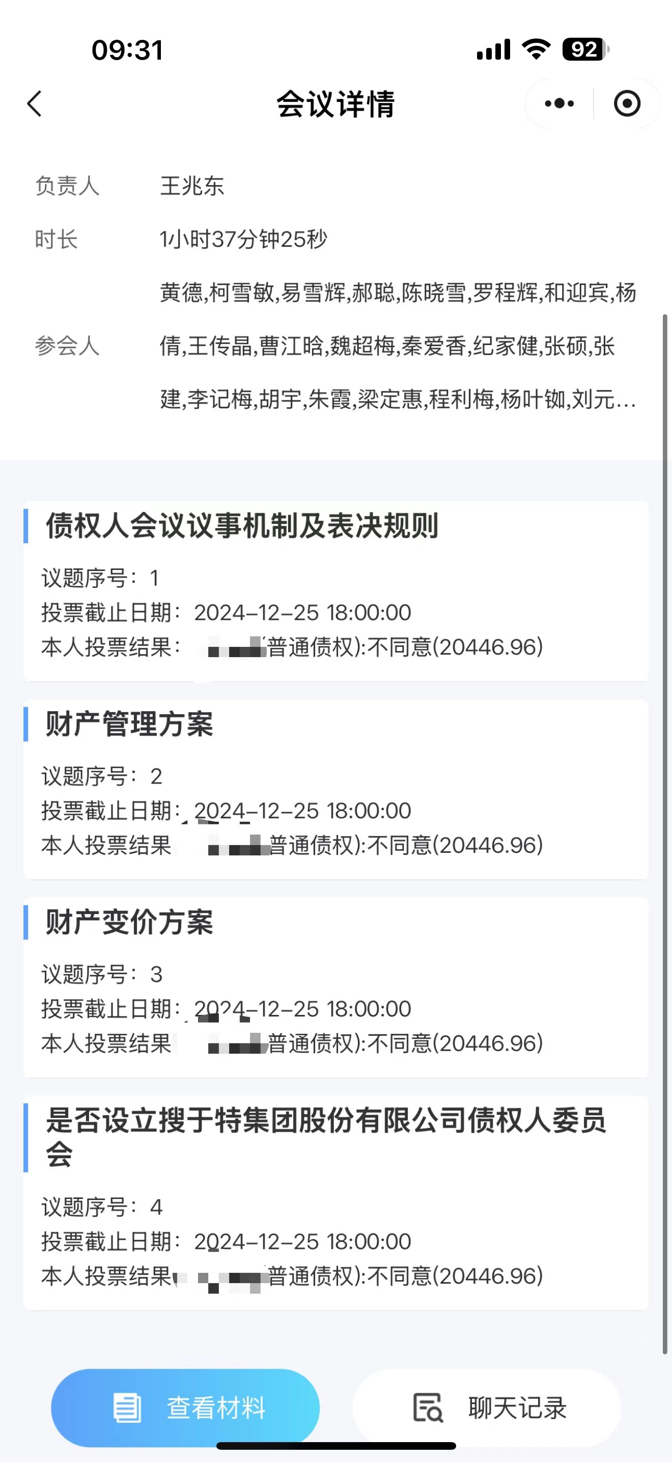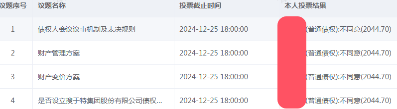 这是投票的第一项,债务人议事规则,授权债务人委员会按照所代表的债务规模比例代表,完全没有对现在持有人散户的优待,我们转债加一起只有7.8亿债务,如果按照他们说的办,那农行一家的12亿普通债权就压到我们了。所以,我干脆全部反对了所有的项目。