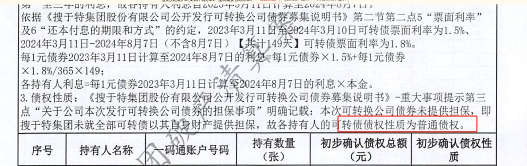 2024年12月7日管理人公开了搜于特集团股份有限公司第一次全体债权人会议的会议资料,在该会议资料中,搜于特可转债持有人为普通债权人。异议人认为管理人把搜于特可转债持有人列为普通债权人是错误的,理由如下: