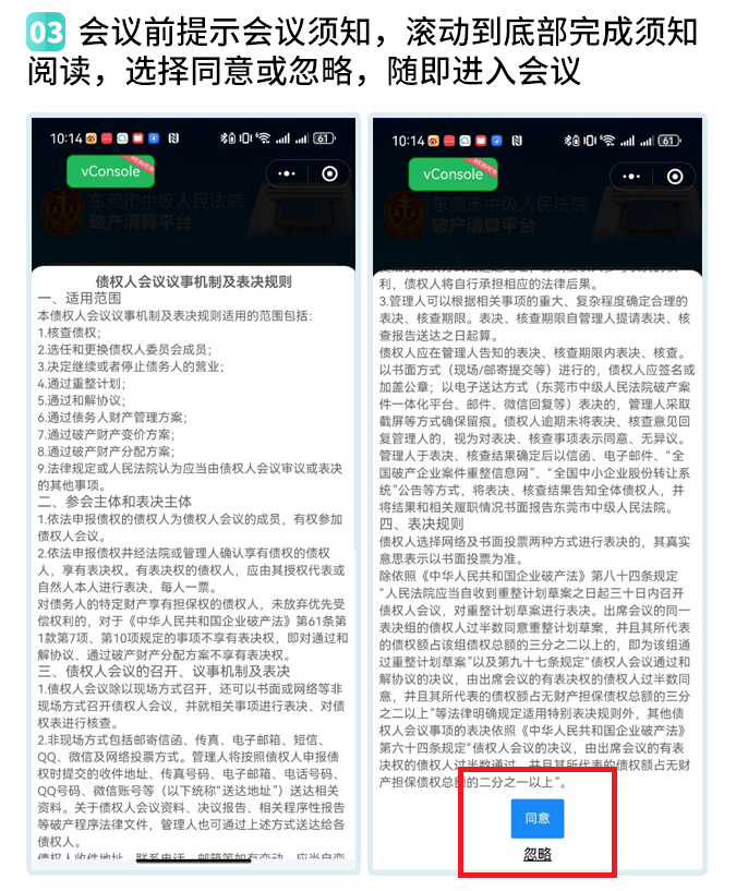 3,加入会议时,查看会议需知后千万不要着急点“同意”,如果点击“同意”,后面超时不投票,就会默认为赞同所有议案,建议选“忽略”。