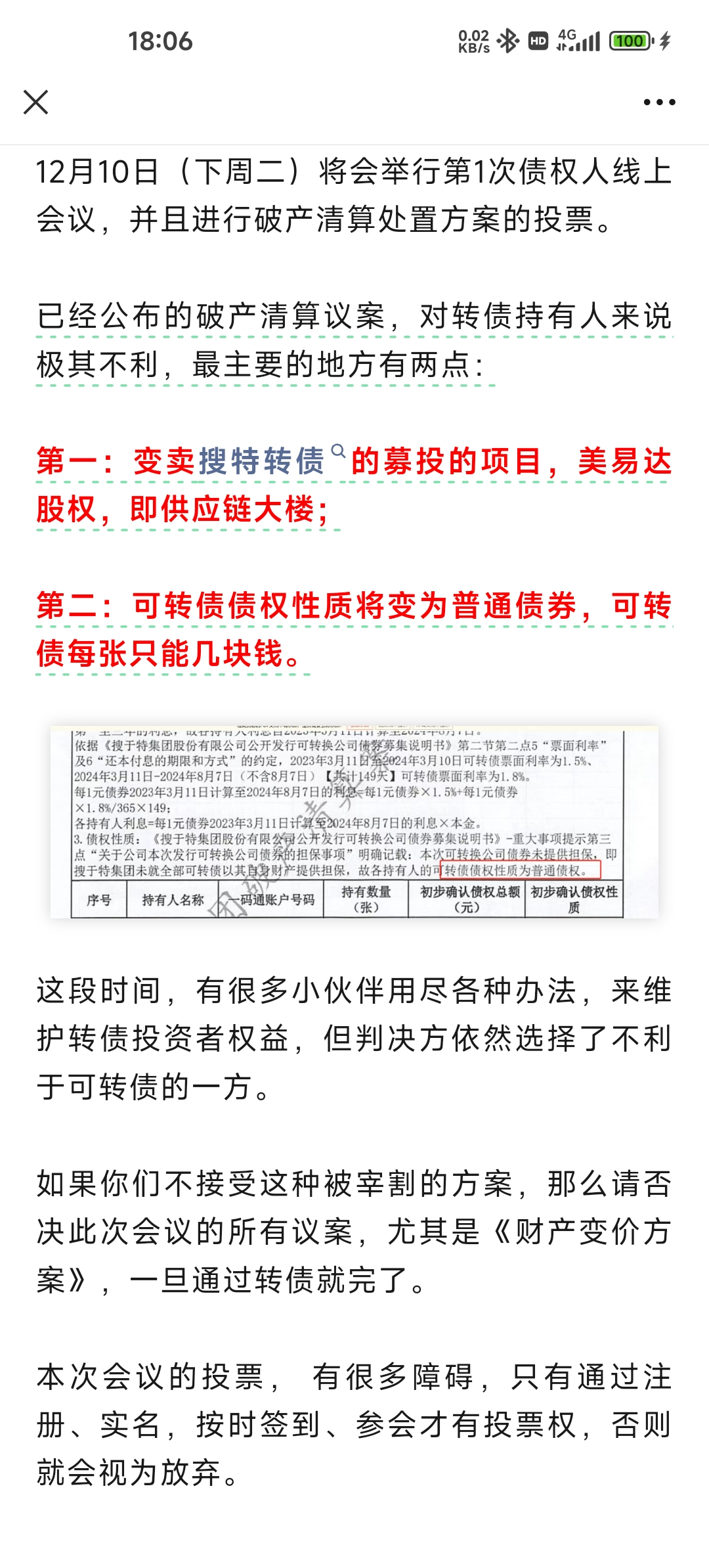 至今不给发搜特转债债权人会议公告!就是为了拖延阻止我们可转债推选出代表既然我们可转债人进不了,大家也只能投出反对票!