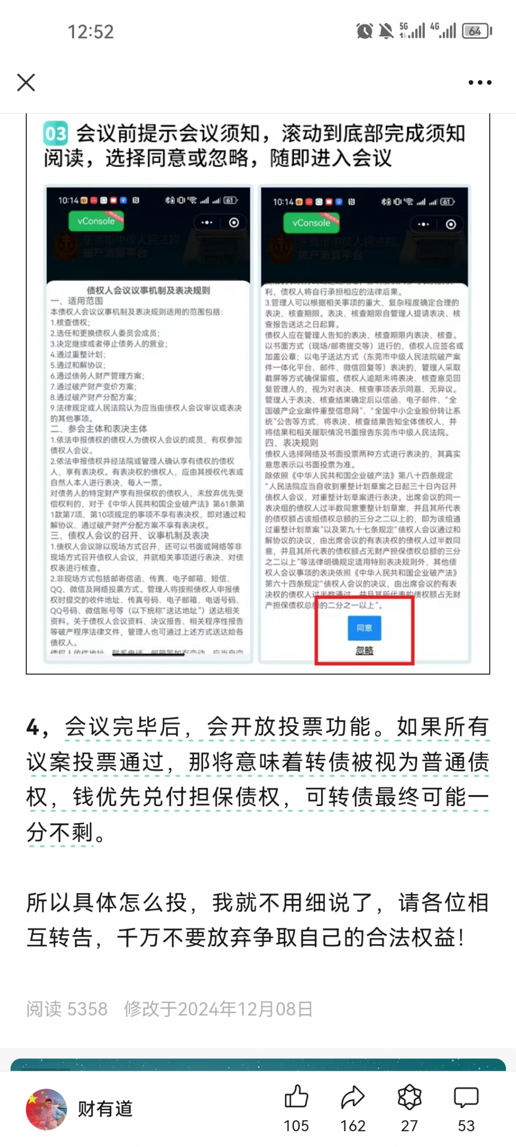 4,会议完毕后,会开放投票功能。如果所有议案投票通过,那将意味着转债被视为普通债权,钱优先兑付担保债权,可转债最终可能一分不剩。