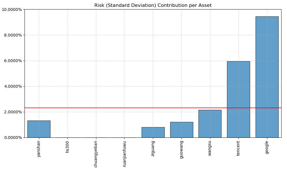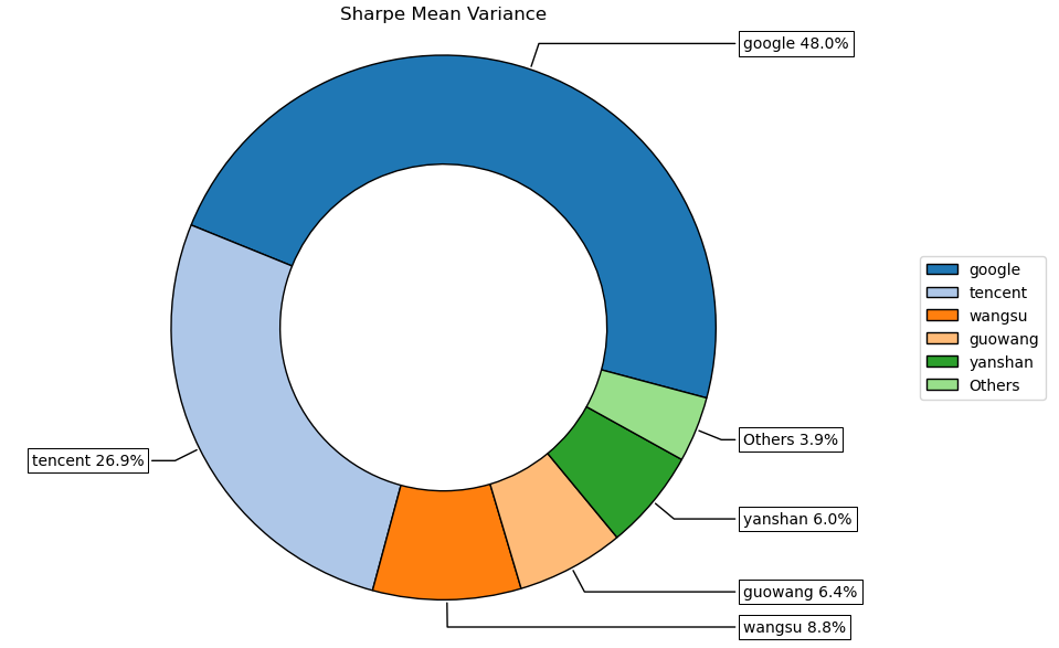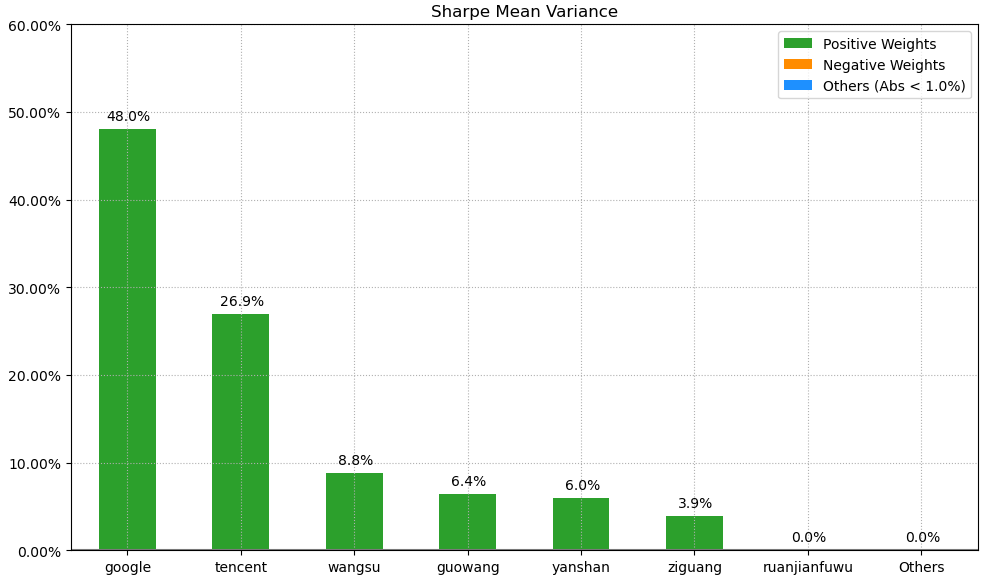 按最高夏普比率配置的话,系统给的权重为6.0%,最大权重给了美股的谷歌占比48.0%。
