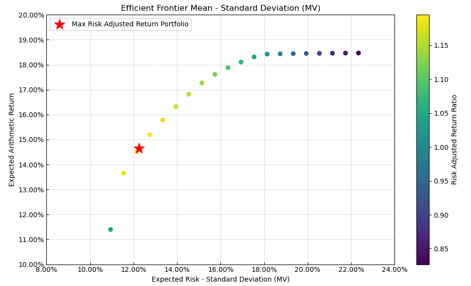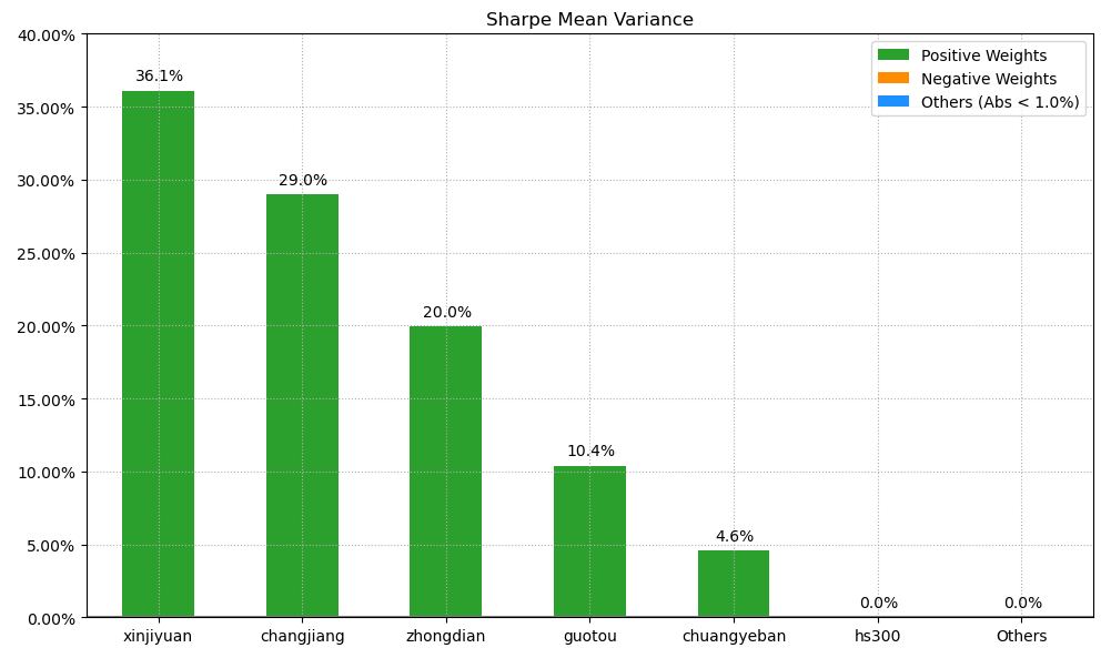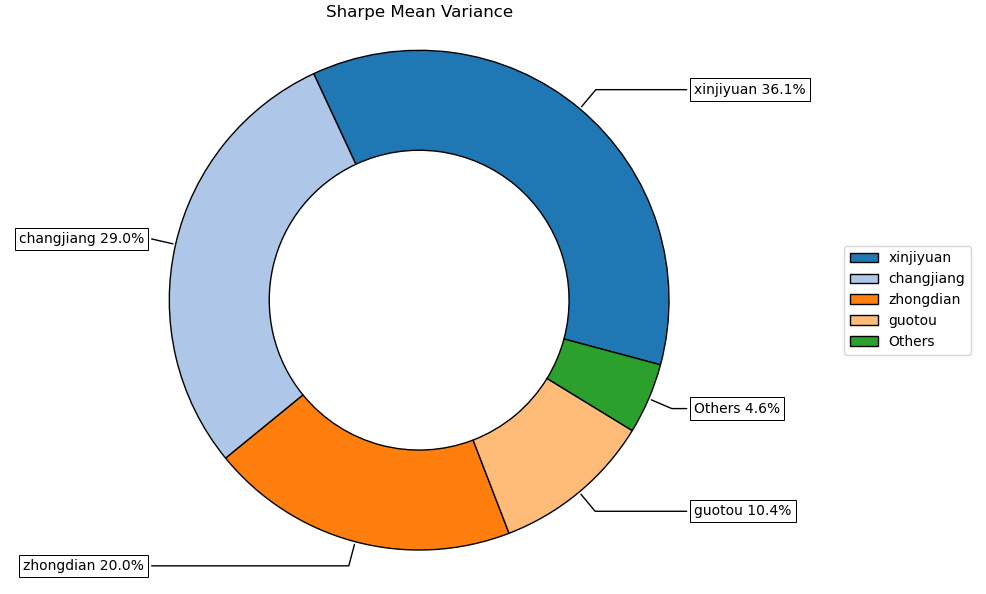 按最高夏普比率配置的话,系统给的权重为0,最大权重给了美股的新纪元能源占比36.1%。