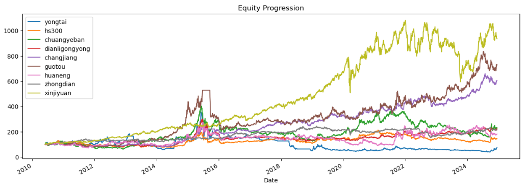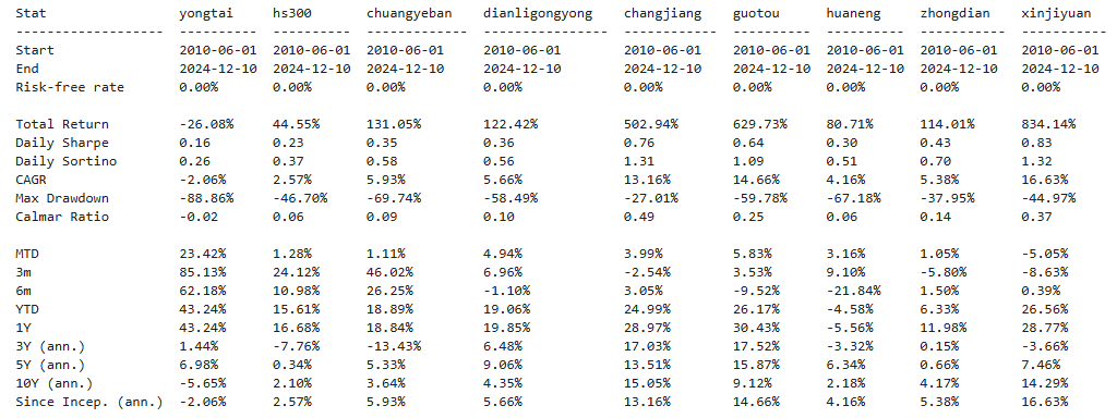 区间累计回报近8倍,最大回撤18.66%,投资组合的表现整体是要好于永泰能源个股的。整个电力公用事业行业盈利能力一般,但波动也是真的小,夏普比率1.19是目前已知的最高水平。