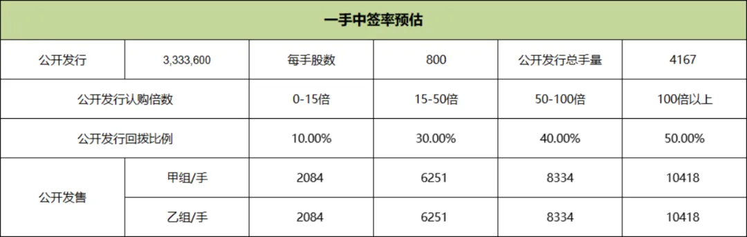 公开发行总计333.36万股,每手800股,公开发行总计4167手,当前超购 2651倍,假设60000人申购,一手中签率8%。