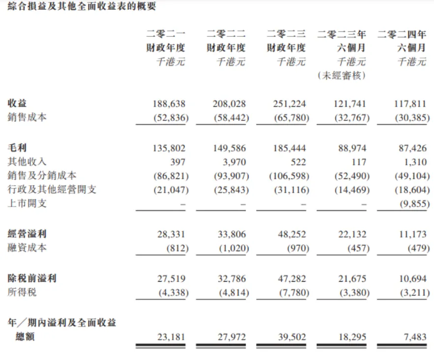 公司于2021年至2023年录得稳定增长,收益由2021年的约1.89亿港元增至2022年的约2.08亿港元,并进一步增至2023年的约2.51亿港元,复合年增长率约为15.4%,又由2023年六个月的1.22亿港元微跌至2024年同期的1.28亿港元。