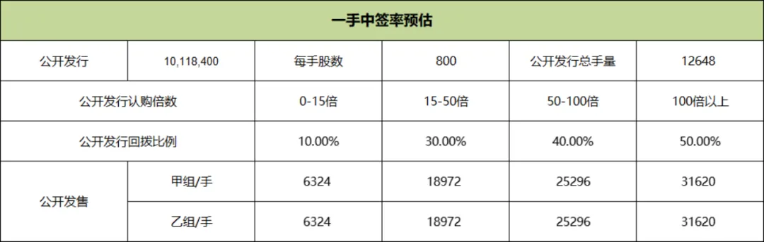 公开发行总计1011.84万股,每手800股,公开发行总计12648手,当前超购0.41倍,假设3000人申购,一手中签率80%。