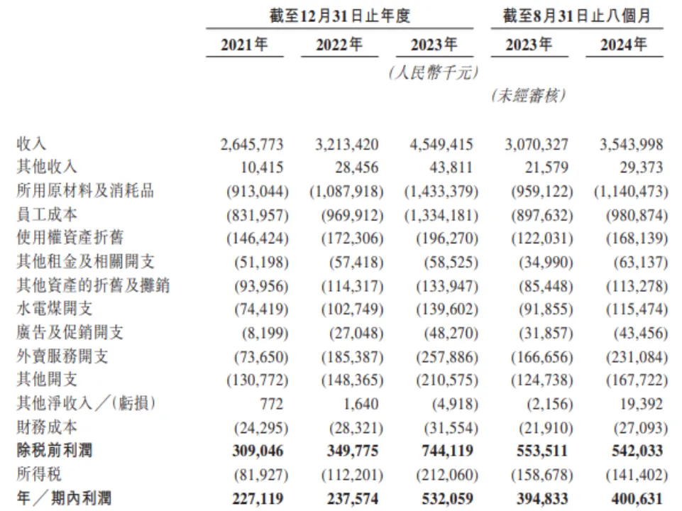 公司的收入由2021年的人民币26.46亿元增长至2022年的人民币32.13亿元,并进一步增加至2023年的人民币45.49亿元。又由截至2023年8月31日止八个月的人民币30.7亿元增加至24年同期的35.44亿元。