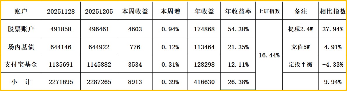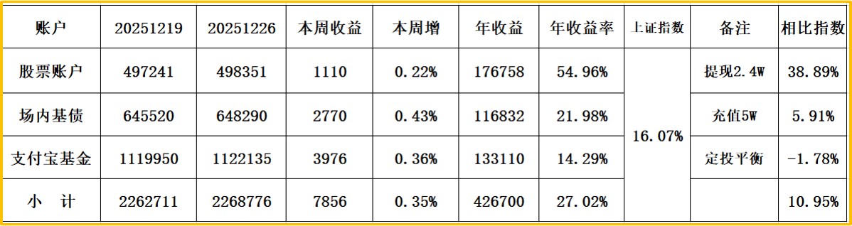 1、股票账户:周+1.27%,+5202元,年26.56%(9.178W); 仓位88%