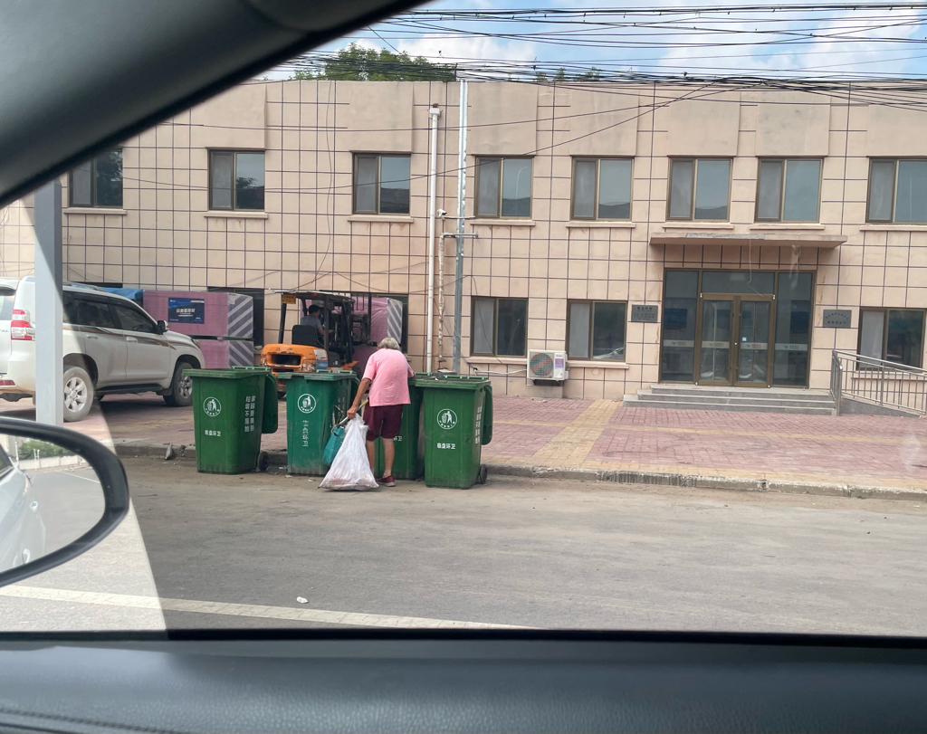 从头到尾,她都没有看停车在路上,给她让行的我一眼,她虽然老态龙钟,背驼的已经扭曲,严重影响她的行动,但她在垃圾桶里翻检的动作是如此的熟练、热切