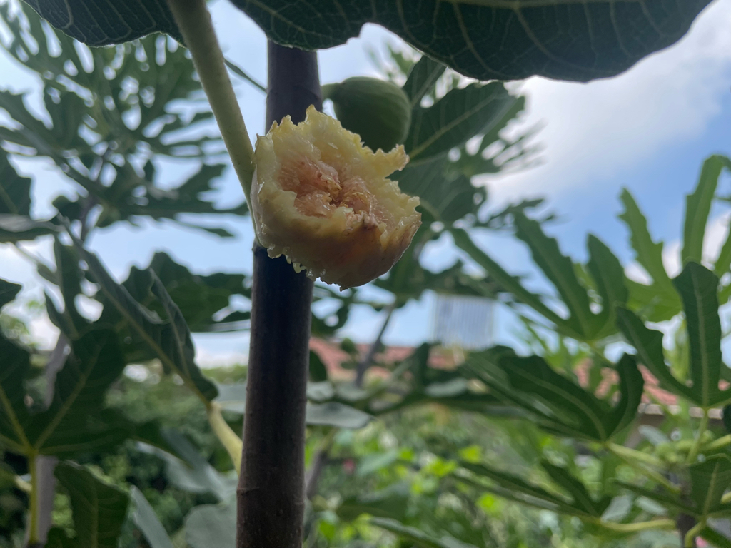 今天上午在院里散步时,我随手摘了3个熟透的无花果吃掉,把另外两个熟的开裂流蜜的果子依旧留在了枝头