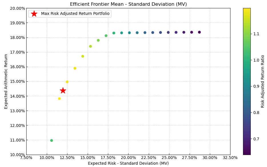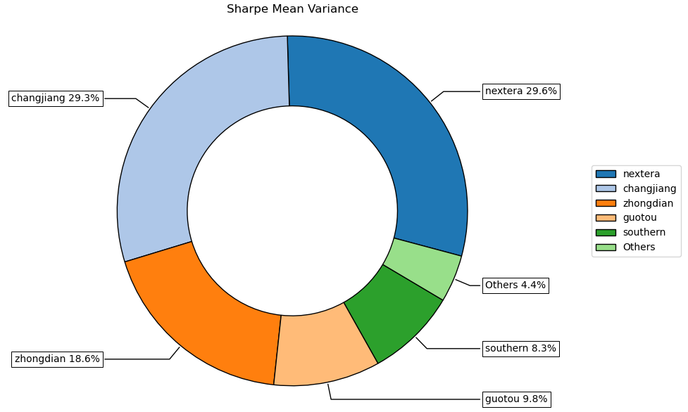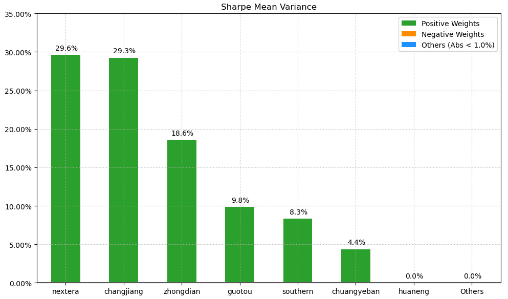 按最高夏普比率配置的话,系统给的权重为29.3%,最大权重给了美股的新纪元能源占比29.6%。