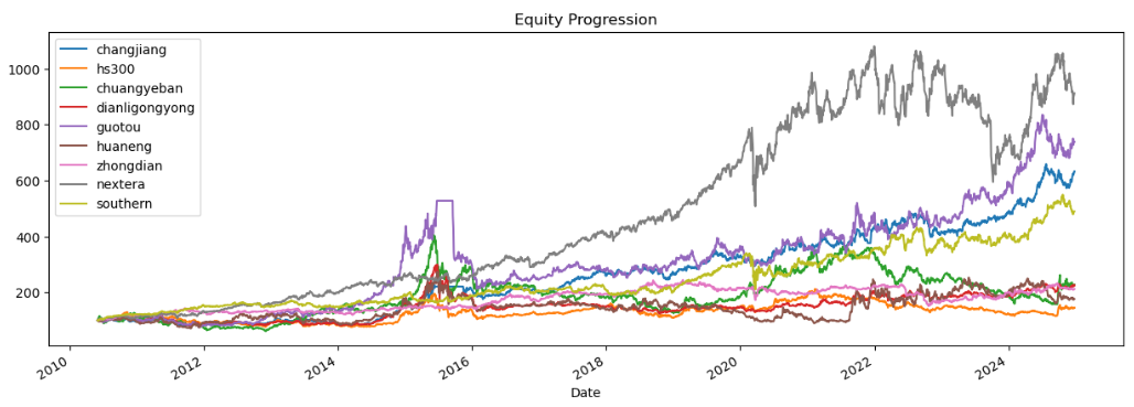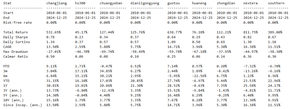 长江电力,基本面良好,历史表现四平八稳,但是目前估值不低,回调买入会更好。整个电力公用行业历史表现波澜不惊,但波动是真心低,夏普比率性价比很高,值得重点关注,美股看新纪元能源,A股看长江电力。