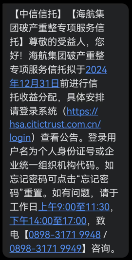 发短信通知12月31号前分配2024年的信托收益。去年信托分配的速度,海航需要3千年才能还清欠债。今年不知会分配多少。海航这次破产重整彻底摧毁了债券市场,整个信用体系都受到了威胁。一个公司竟然能通过破产重整,就可以不还债了,而所有经营依旧照常运转。这简直是个匪夷所思的结果。现在我也不指望什么了,只希望海航能破产倒闭,彻底清算。