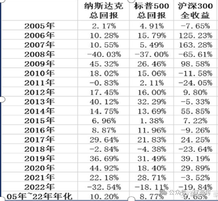 那我们的大A股情况如何呢?沪深300全收益指数2005年-2022年的年化收益率为9.65%,同期纳斯达克指数年化收益率10.2%,标普500年化收益率8.77%,基本相近。