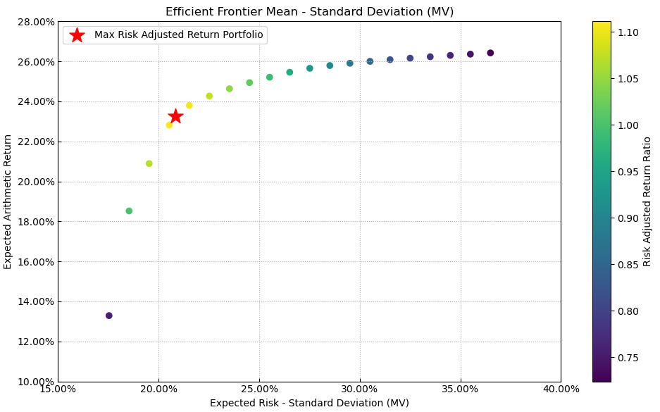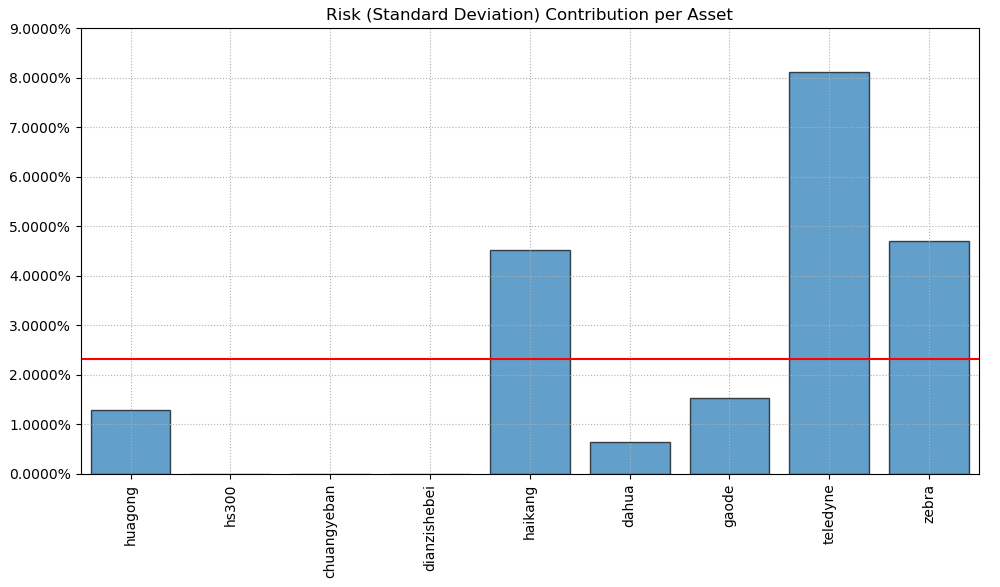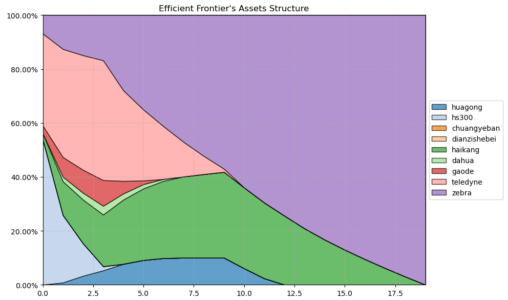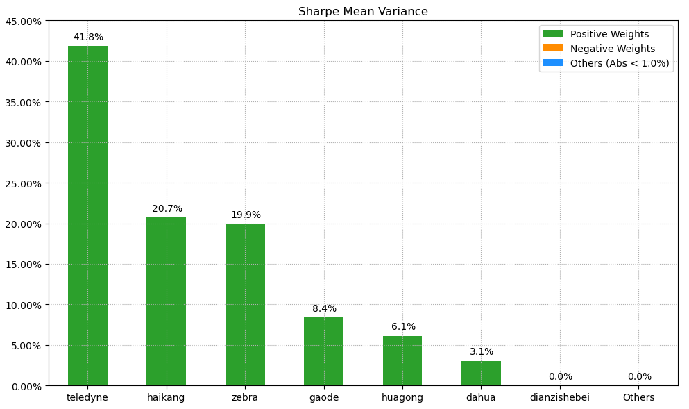 按最高夏普比率配置的话,系统给的权重为6.1%,最大权重给了美股的TELEDYNE占比41.8%。