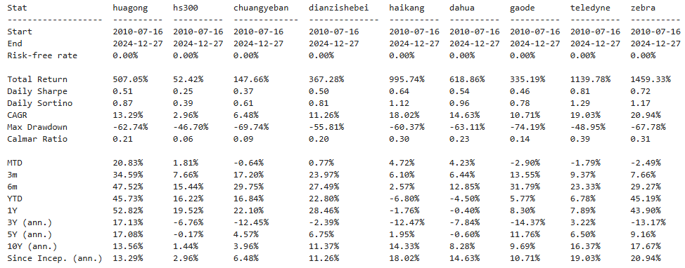 区间累计回报近16倍,最大回撤43.73%,投资组合的整体表现是要好于华工科技个股的。整个电子设备行业盈利能力一般,波动也不小,夏普比率1.11差强人意。