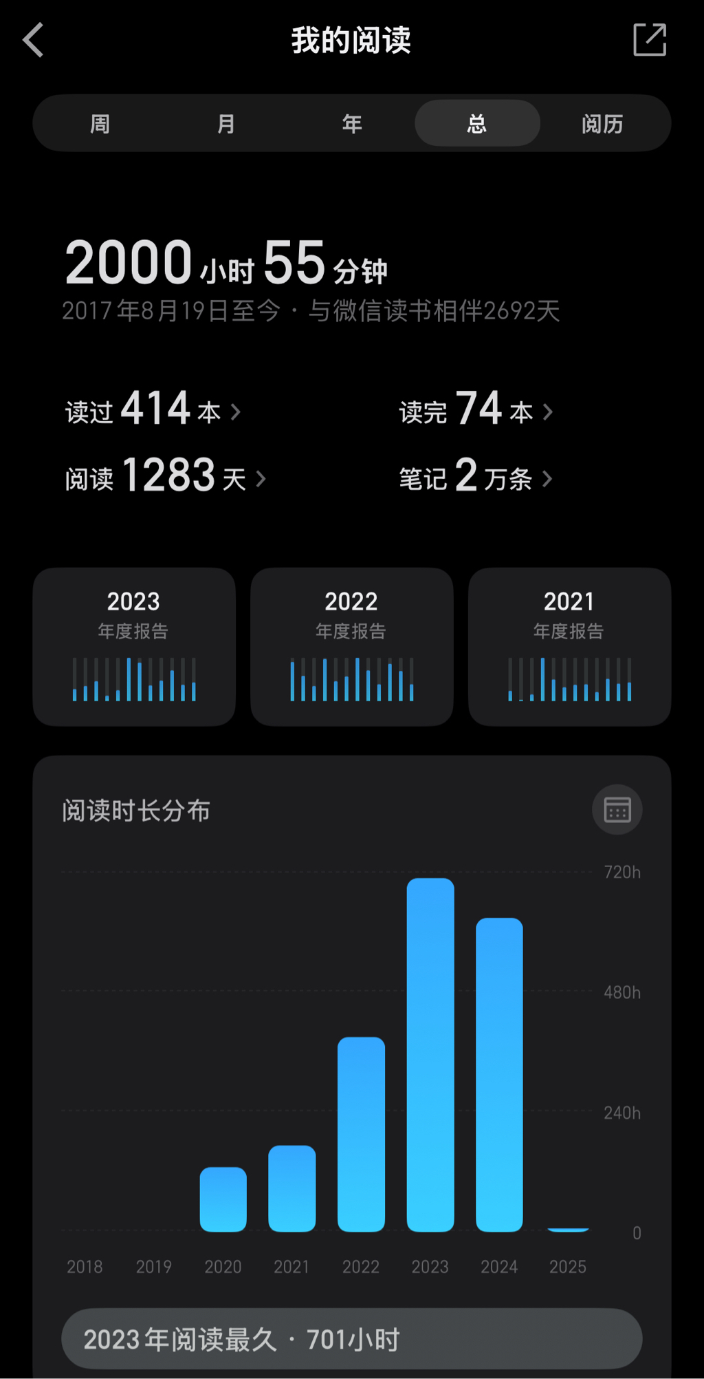 发现真是太多太多,有点数不过来,看了下阅读记录,今年总计读书620个小时,日均阅读量近2小时的样子。