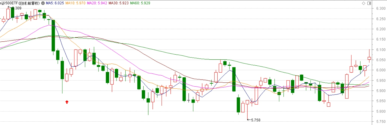 打开这张图,经过了一段相对低位的震荡,最后通过中阳线启动向上突破。这就是两年前的今天的500ETF走势图。对应的是高层召开经济会议,发出了“活跃股市”的号召。