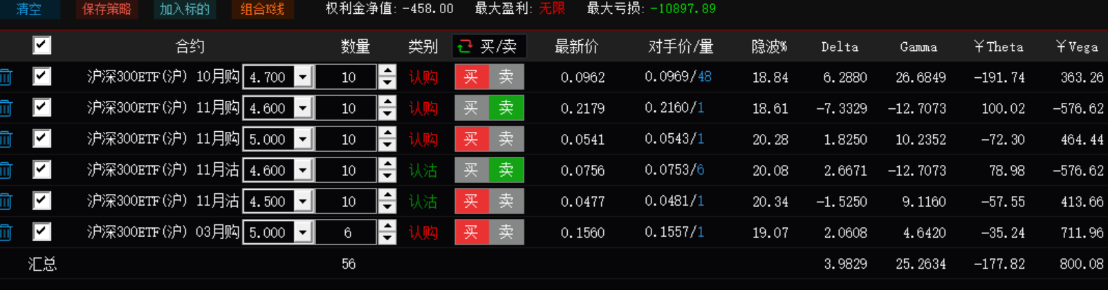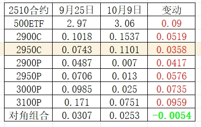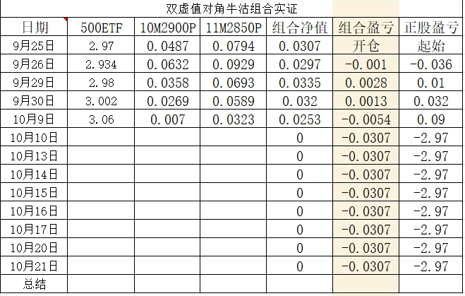 这是从9月25日开始到10月9日的实盘数据。由于最新收盘价3.06元,10月2900沽因为变成虚值合约而几乎成为废纸,做多成功。另外,远月虚值合约因为到期还早,所以哪怕依旧是深度虚值,却还是能保持相应的残值价格。因此如果双平的话,可以回收残值。表格里的具体情况供大家参考。