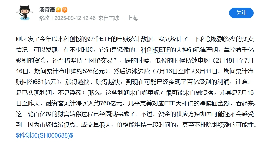首先看一下上面两张图。第一张是2015年创业板指数的PE曲线,最高超过80倍市盈率。第二张是2025年科创板50的PE曲线,超过180倍市盈率了。也就是说,我们的大A炒作市梦率的胆量已经迈上了新台阶。到底是谁在追捧科技股呢?很显然,公募基金抱团是一个重要因素,而另外一个资金来源我从雪球论坛上的一个帖子里找到了答案。