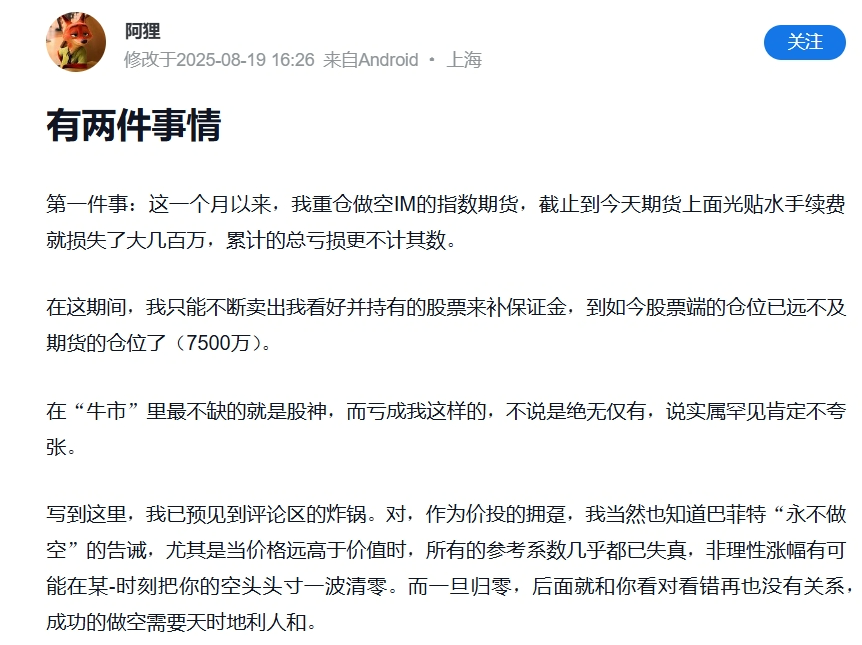 我自己没有期货交易经验,在这个线性盈亏曲线面前,看来止损减仓是不二法门。但是,我有期权经验,所以类似这样做空被套的经历一点不陌生,2021年就体验过的。