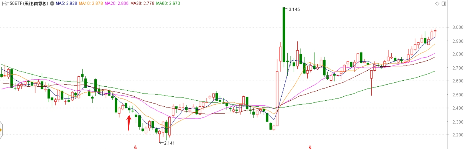 附上50ETF周线图。用红色箭头标注了这位网友开仓的大致时间。大家看看体会一下。