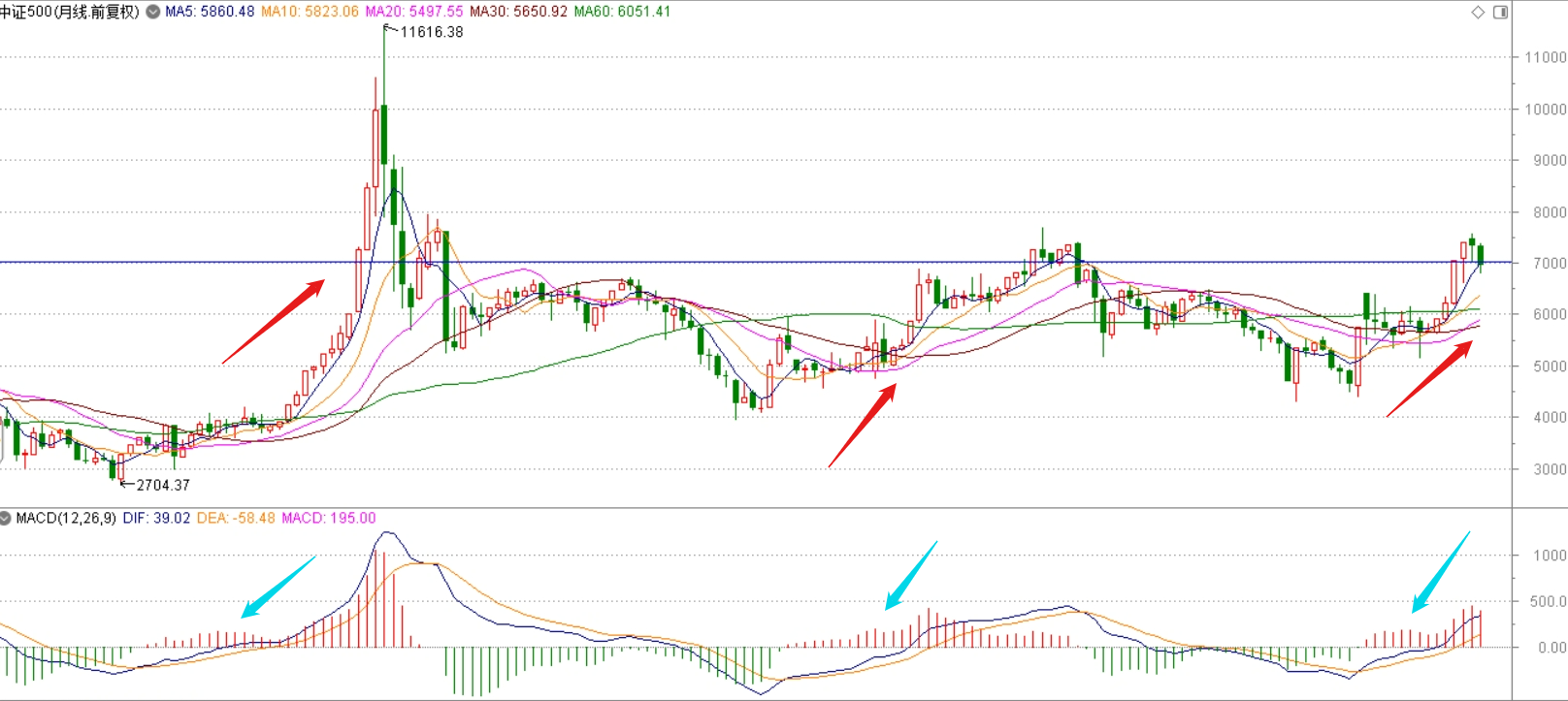 很显然,这一次的牛市已经无法复制2015年那次杠杆水牛行情了。原因无非是市场的卖方量能已经急剧扩张,买方的资金面即使能把日均成交量放大到2万亿也难以推动整体上涨了。不过,用技术分析的眼光看牛市却还是有理由的。这就是以月K线为单位的MACD趋势指标已经站在0轴上方,且保持红色柱状体。(图片里的三段蓝色箭头指向)