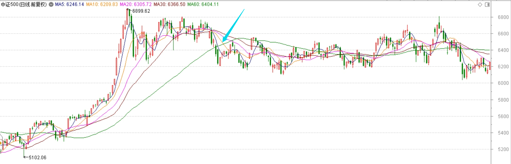 在经历了2020年7月的爆发性上涨之后,蓝色箭头指向的是指数跌破了60均线,而且事后发现居然从2020年9月跌破后一直到2021年4月才真正向上突破60均线。这段高位震荡的历程同时也是抱团赛道股疯狂的阶段。